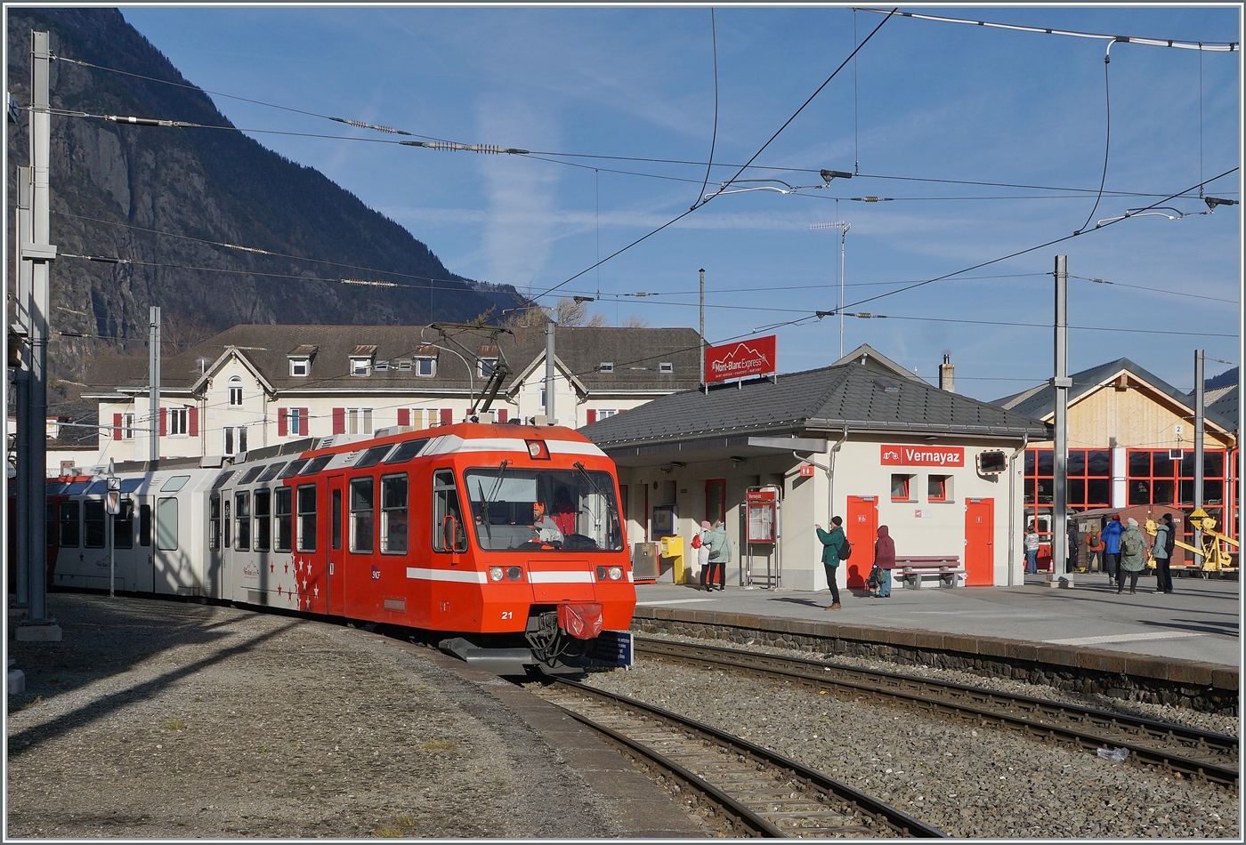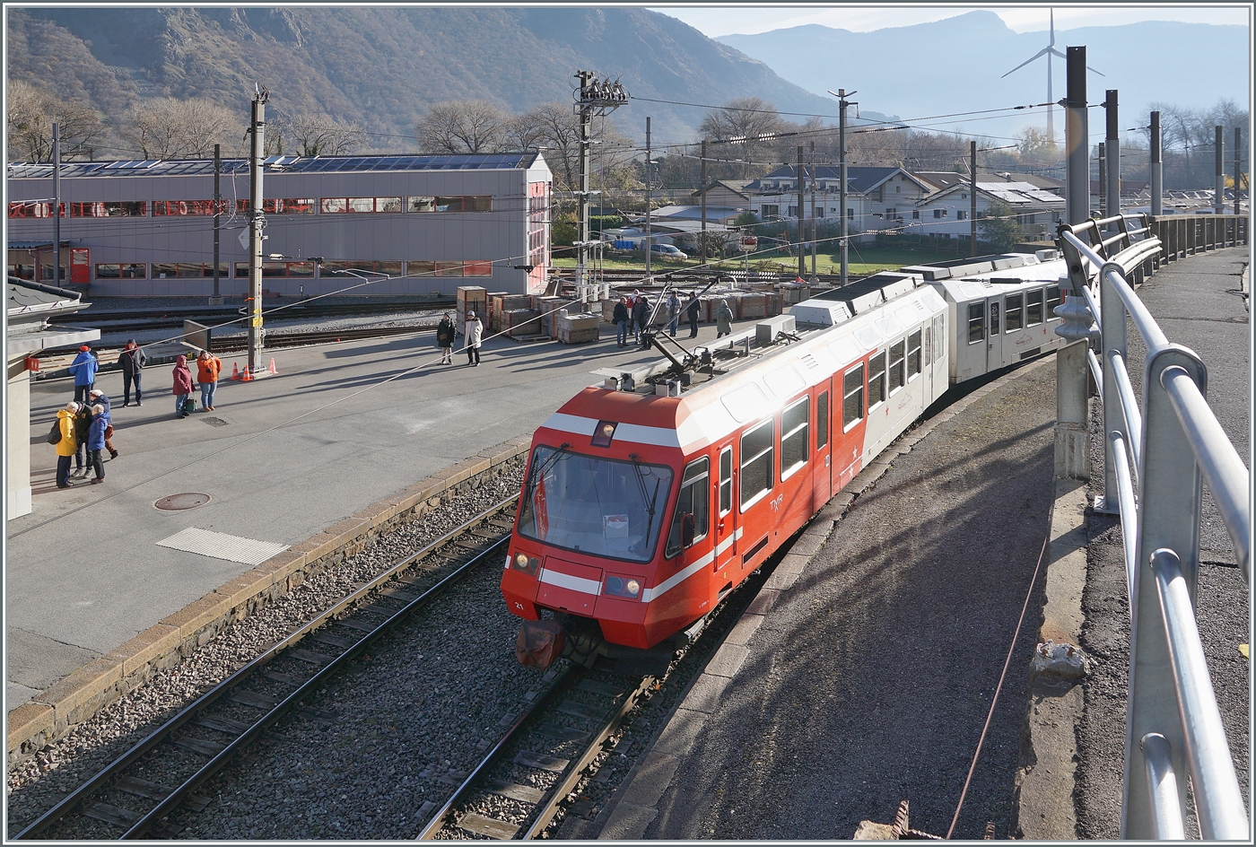Der BDeh 4/4 N° 5 schiebt den BDt N° 65 bergwärts Richtung Le Châtelard. Das Bild entstand kurz nach Le Trétien, auf dem Stromschienenabschnitt.