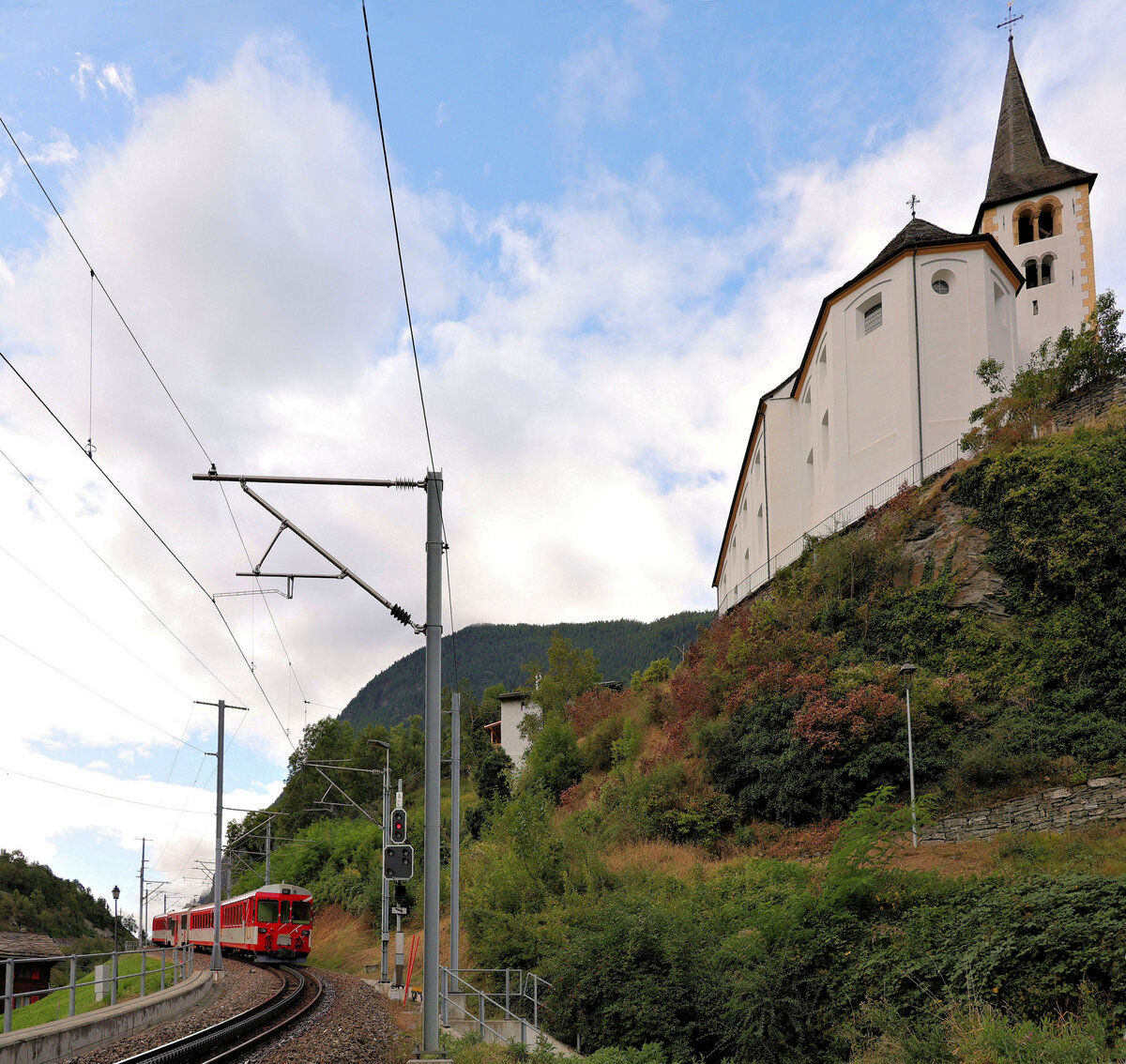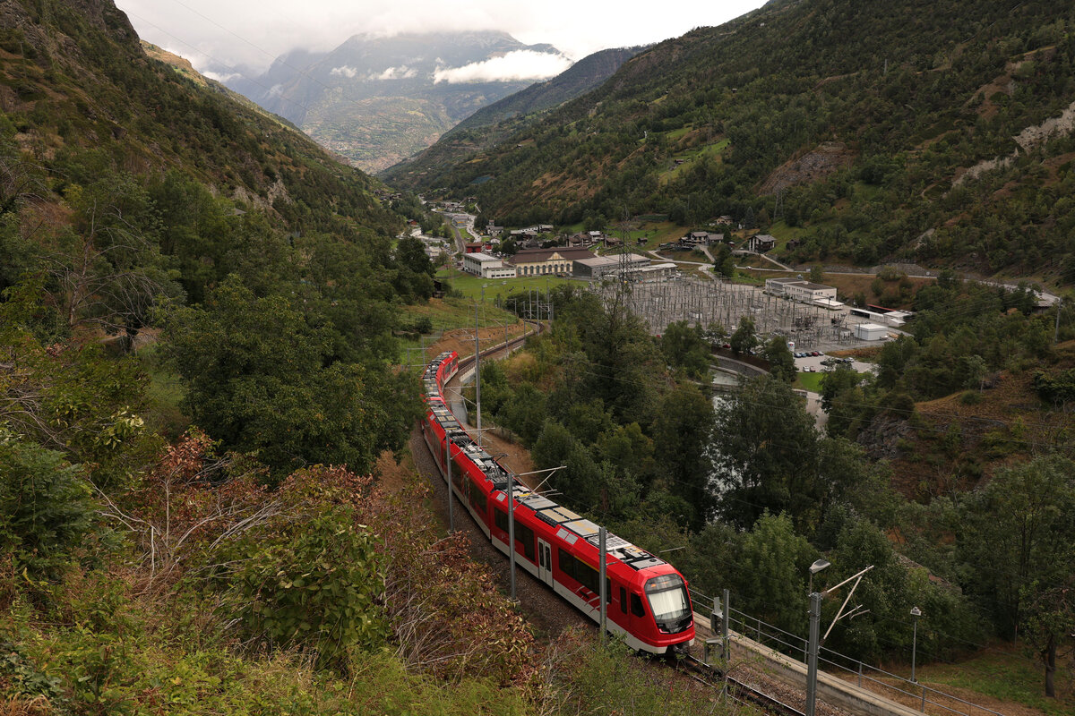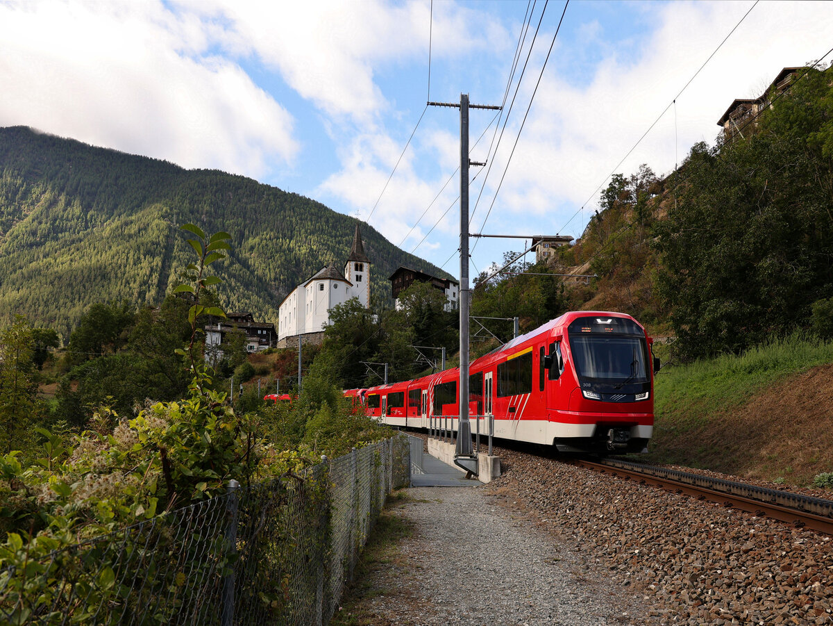Der MGB Deh 4/4 95 mit ihrem Regionalzug 525 Andermatt Visp beim Halt in Fiesch.