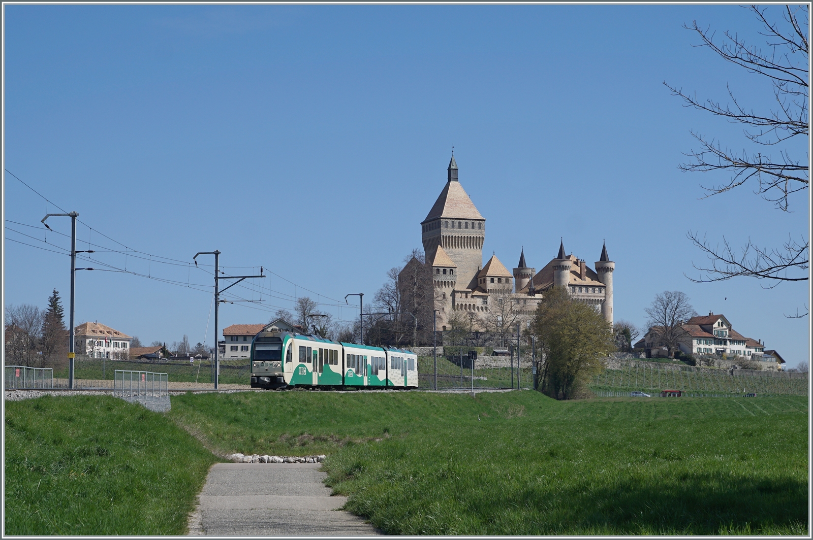 Vor dem klassischen BAM Hintergrund des Château de Vufflens ist ein BAM SURF Be 4/4 - B - Be 4/4 Regionalzug auf dem Weg nach Bière.