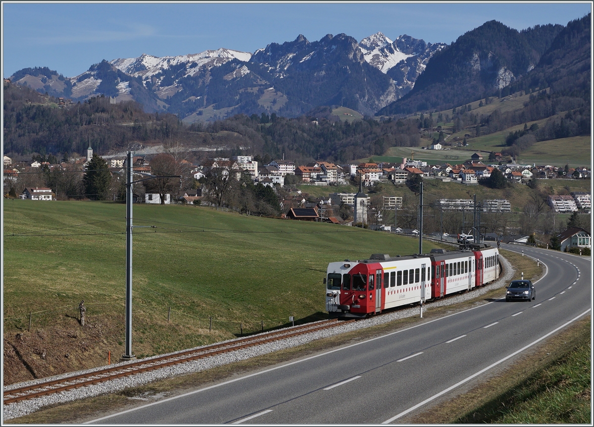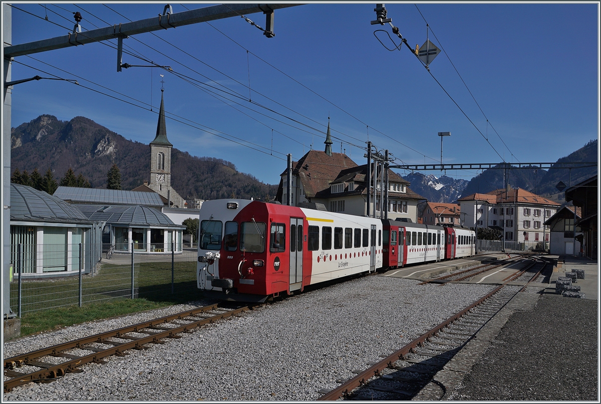 Die TPF Meterspur Strecke Bulle - Broc Fabrique wird nach Ostern auf Normalspur umgebaut, folglich sind dann hier keine Meterspur -Züge mehr zu sehen. Im Bild der TPF Regionalzug S60  mit dem ABt 223, dem Bt 224 und dem schiebenden Be 4/4 124 beim Halt in Broc-Village.