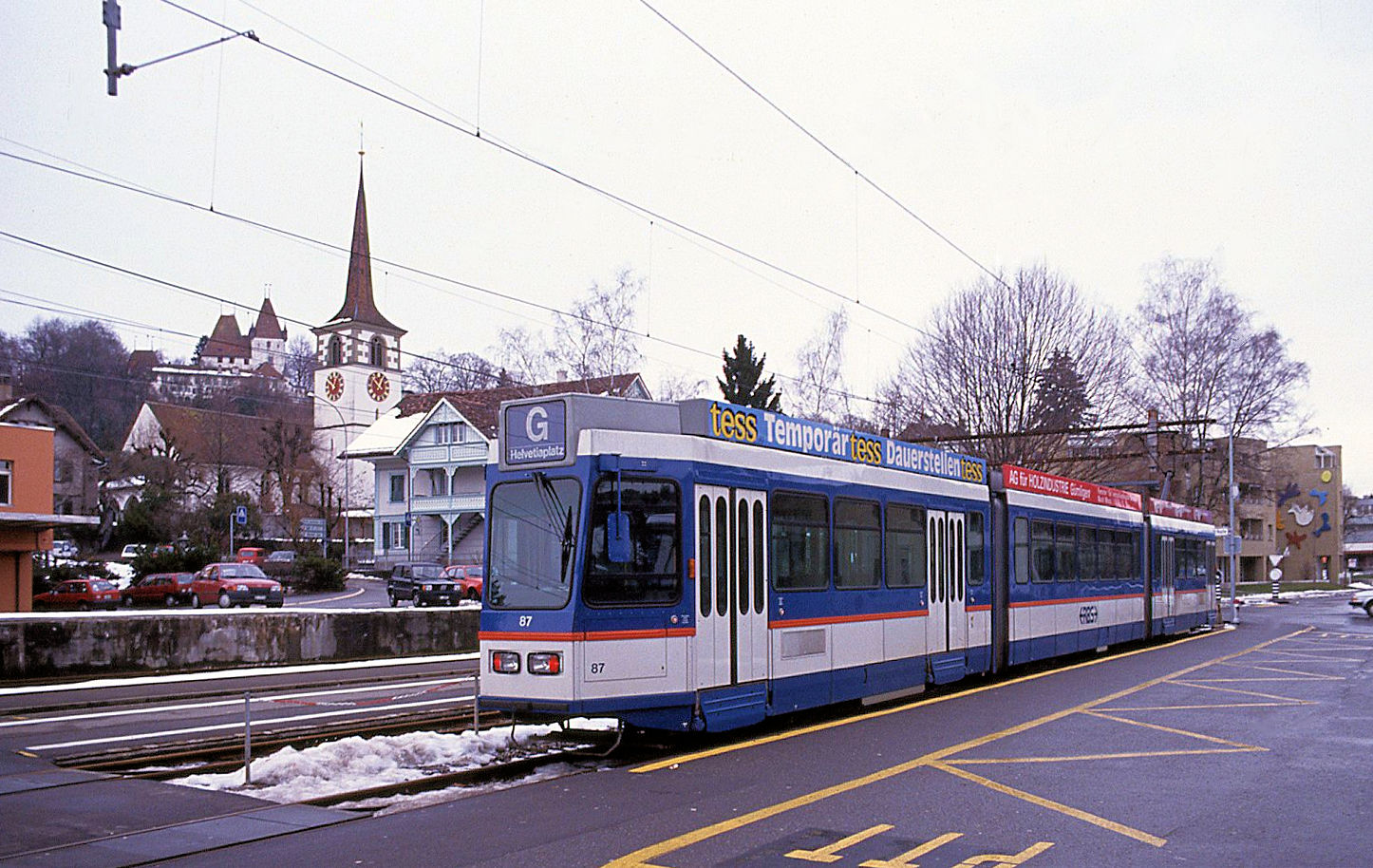 Das Ende naht - die Tramwagen des RBS 81-89: Wagen 87 an der Endstation Worb Dorf, wie sie damals aussah. Im Hintergrund das Schloss Worb. Der Wagen trägt noch die Liniennummer  G  und die Fahrzielangabe  Helvetiaplatz . 30.Dezember 1990   Vor allem gibt es hier noch keine Schlaufe für Einrichtungsfahrzeuge, die seit 2010 hierher gelangen.