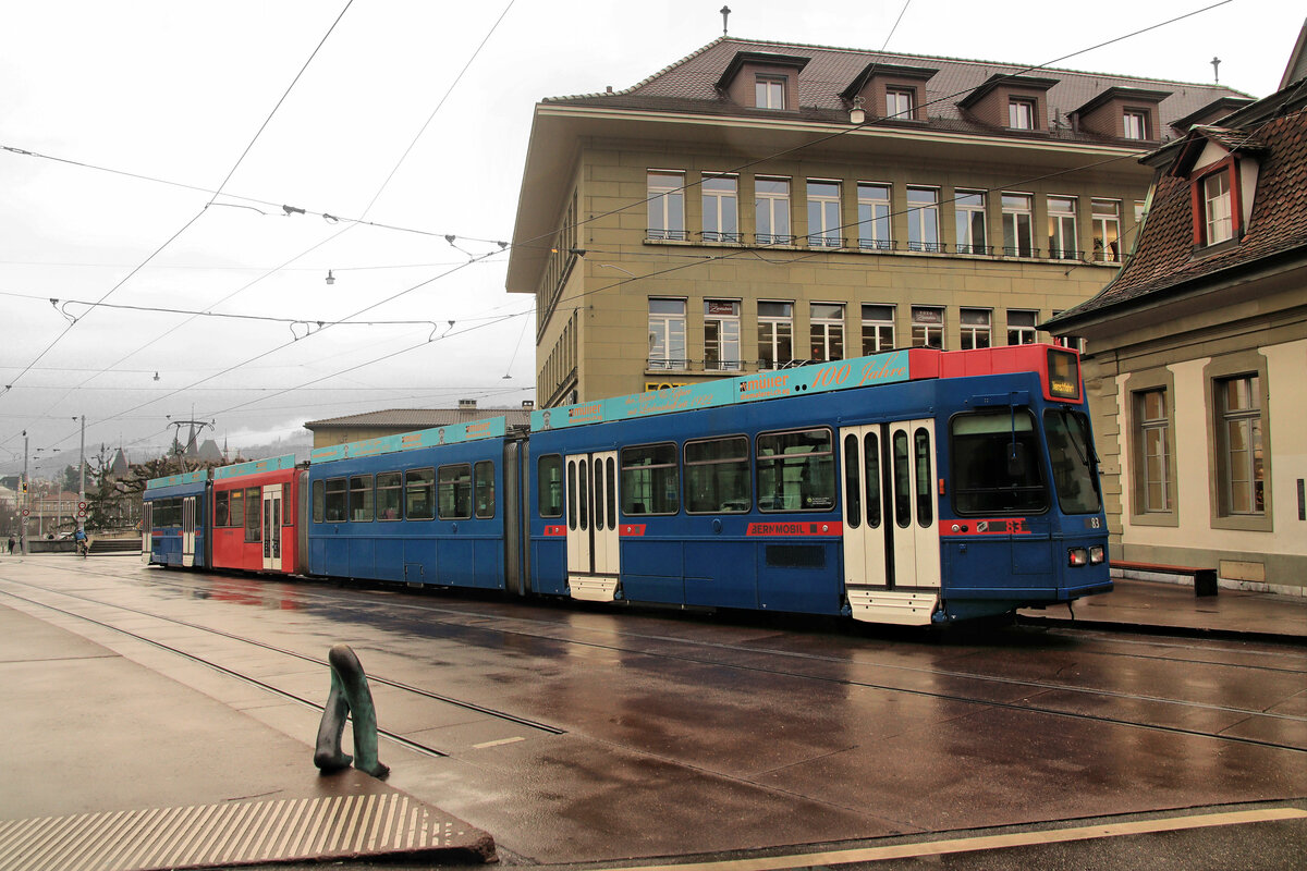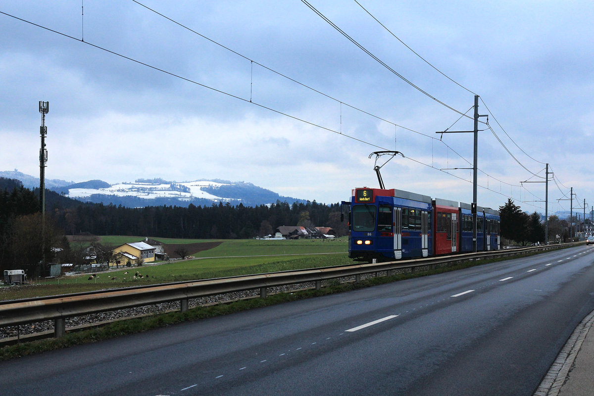 Neben 2 planmässigen Berner Tramwagen wird die Ueberlandstrecke von Bern via Muri nach Worb (Linie 6) von RBS Be 4/10 bedient, die 2010 ein viertes Glied (rot gestrichen) mit Niederflurbereich bekamen. Hier Wagen 82 im Aufstieg von Worb nach Langenloh. 2.Dezember 2020