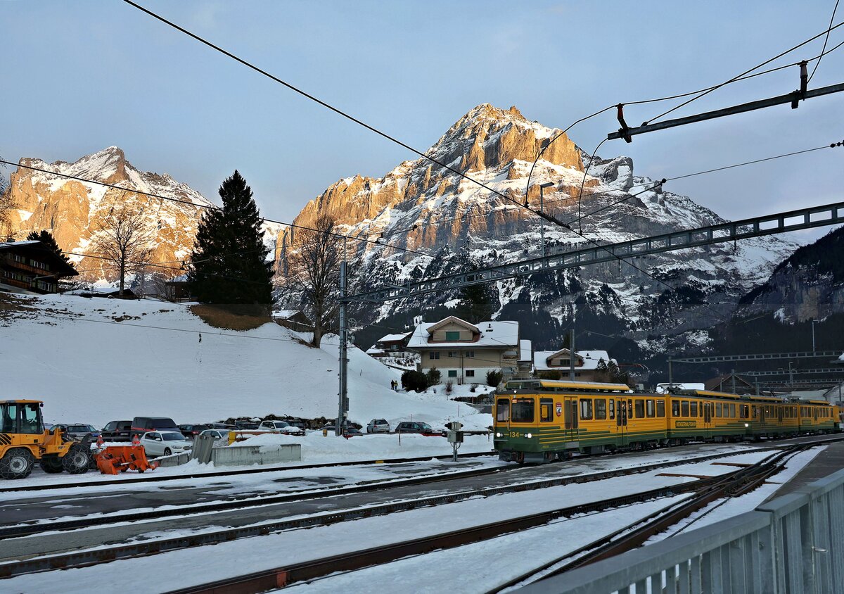 Seit der Eröffnung der Luftseilbahn Grindelwald Grund - Eigergletscher sind auf der WAB nur noch wenige Züge auf der Seite Grindelwald unterwegs. Meist sind es nur noch 3 Züge, wovon zwei Doppeltriebwagen+Doppeltriebwagen+Gelenksteuerwagen. Hier fährt im letzten Abendlicht der Zug Doppeltriebwagen 134+132+Gelenksteuerwagen 252 in Grindelwald Grund ein. 4.Februar 2026