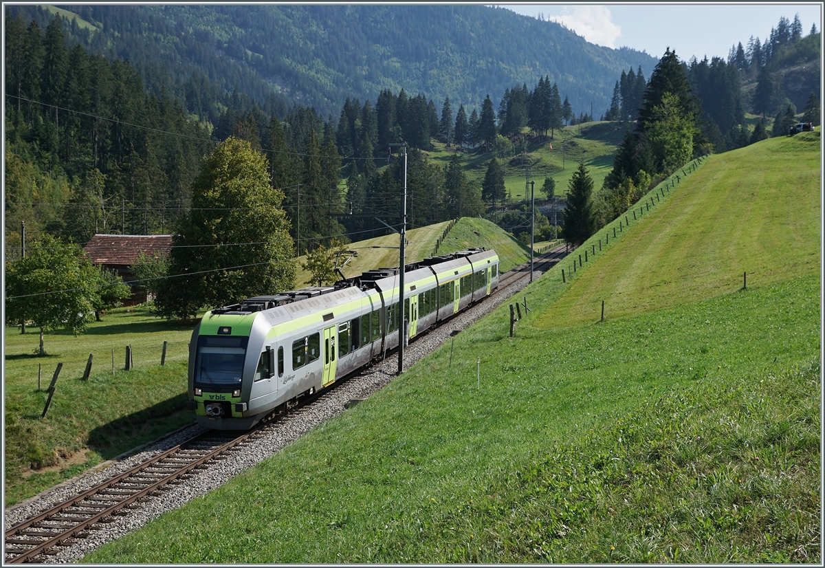 Von einer BLS Re 4/4 II gezogene EW III RE nach Zweisimmen verlässt Boltigen.