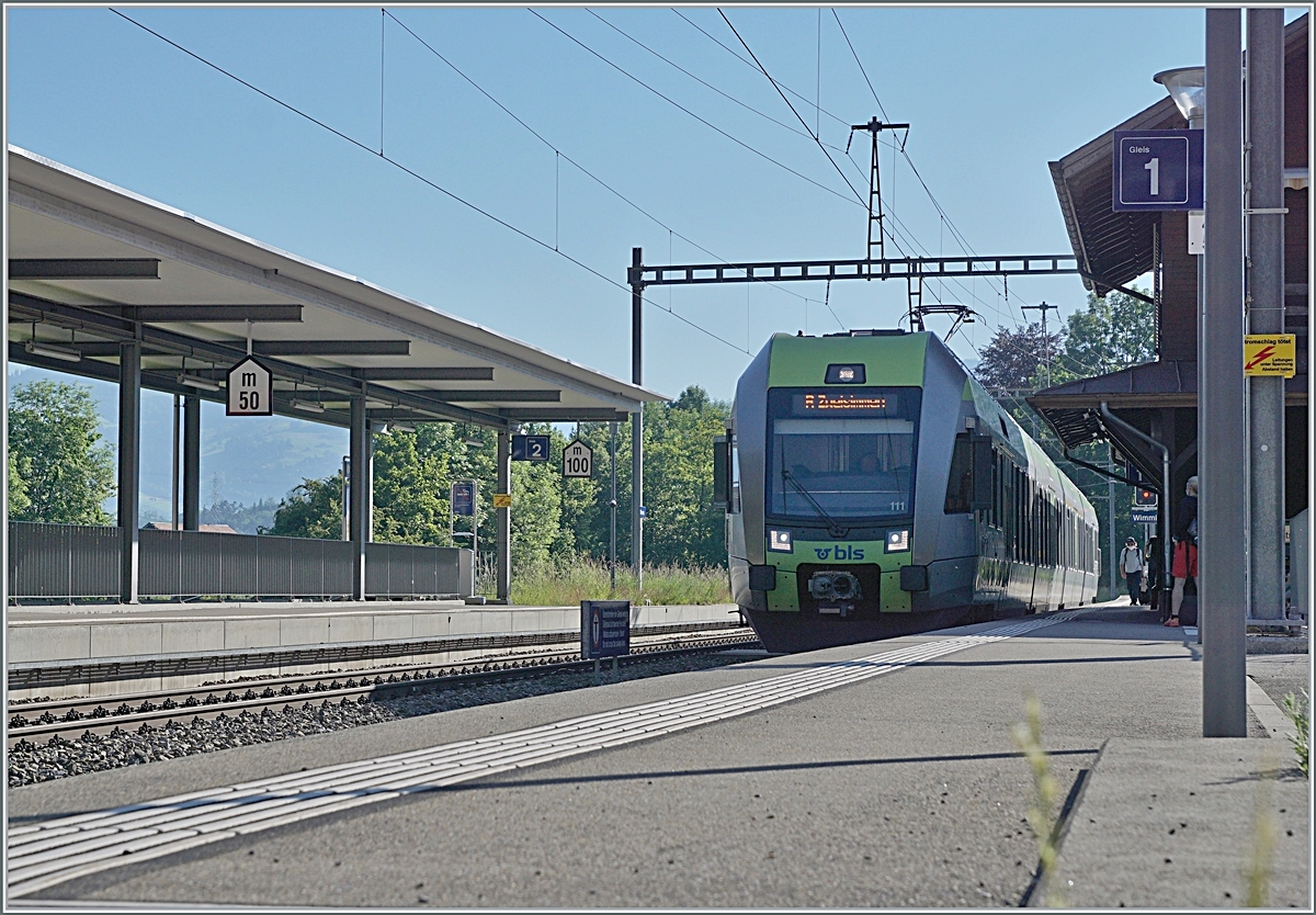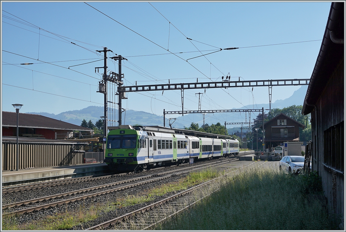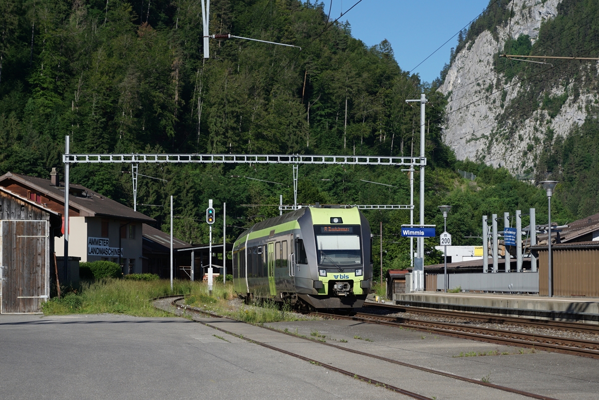 Leider "nur" ein BLS NPZ statt eines EW III Pendelzugs erreicht als RE von Zweisimmen nach Spiez den Bahnhof von Wimmis.