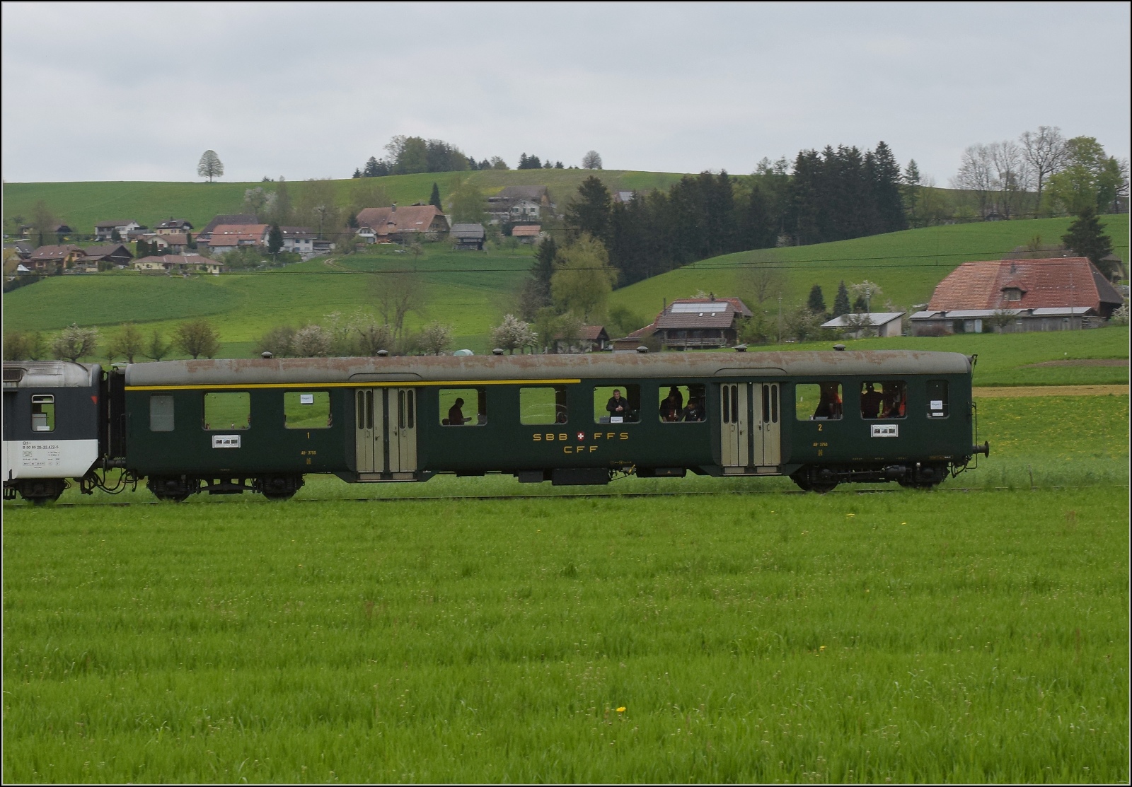EW I-Wagen B 472 in der Version Golden Pass der BLS zweite Klasse, heute dem Eurovapor gehörend. Seine NVR-Nummer lautet 50 85 20 33 472-5 CH-EV. Die Lackierung dürfte wohl auf absehbare Zeit in eine historische Version geändert werden. Grund genug, den Wagen zuvor genauer zu betrachten. Brand bei Rohrbach, April 2023.