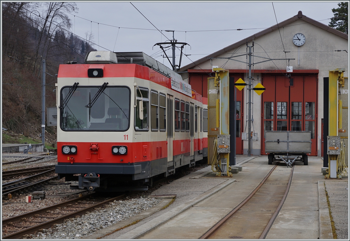 Mit dem Steuerwagen Bt 120 an der Spitze erreicht ein Waldenburger Bahn Zug von Waldenburg nach Liestal in Kürze den Bahnhof Höllstein. 25. März 2021