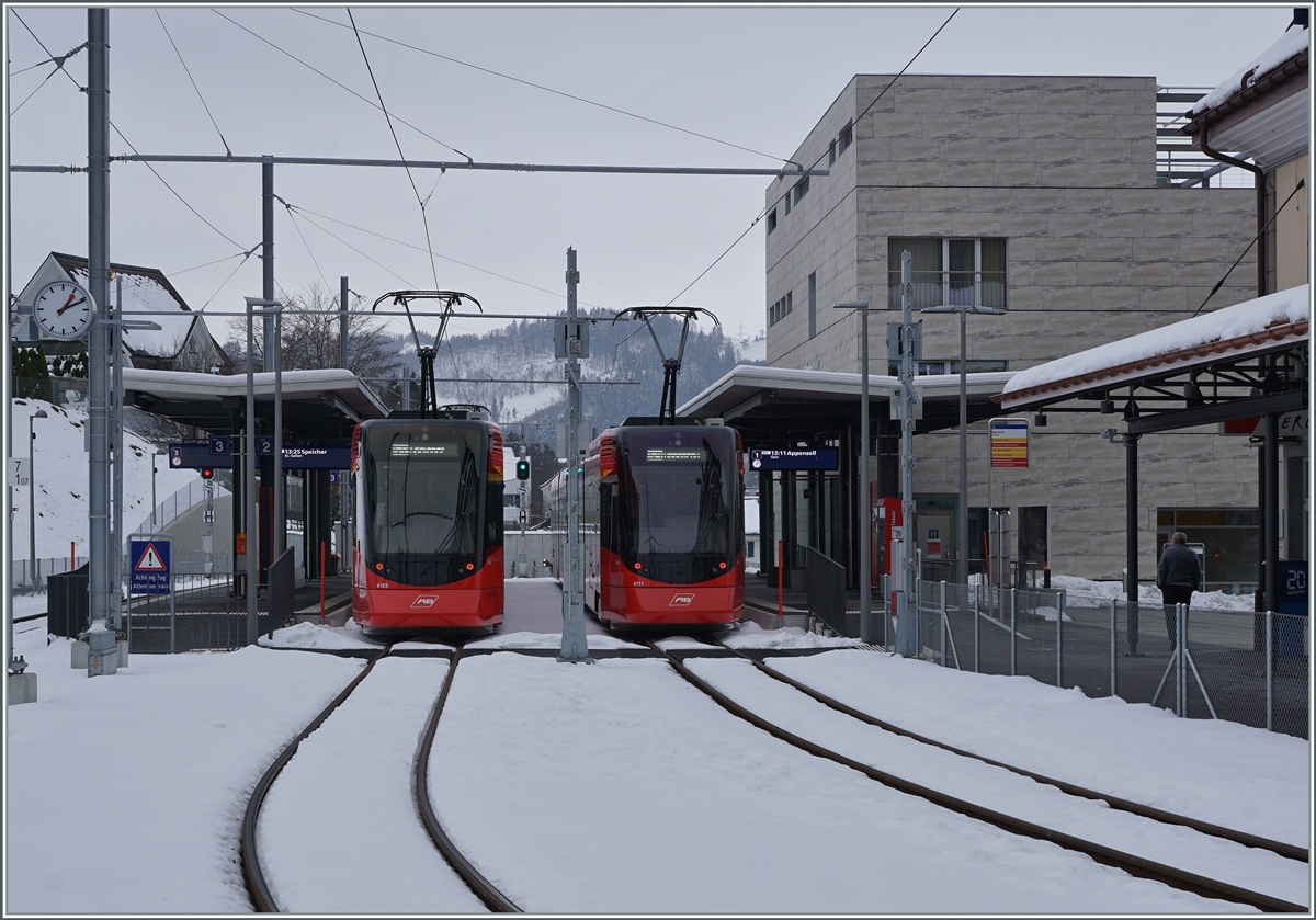 In Trogen stehen die beiden AB ABe 8/12 (Tango) 4103 und 4113; während der ABe 8/12 4103 hier wendet und nach Spicher (via St. Gallen) zurück fahren wird, ist er  ABe 8/12 4113 auf dem Weg nach Appenzell.