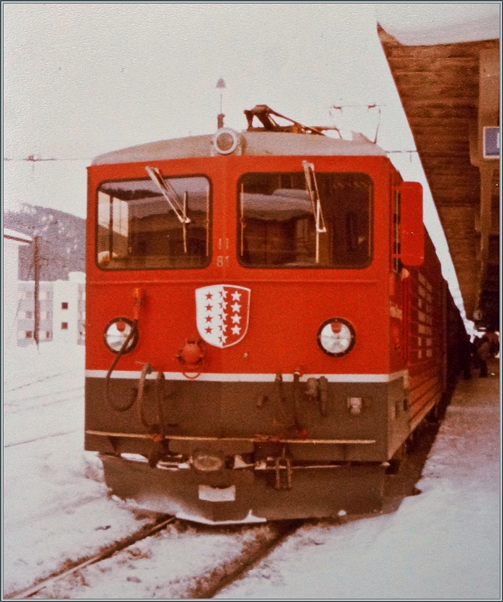 Vor dem Einsatz als "Tunnellok" für die Autozüge durch den Furkatunnel hatte die FO keinen Bedarf an den bereits erhaltenen zwei Ge 4/4 III 81 und 82 und so wurden sie bei der RhB eingesetzt. Im Bild die FO Ge 4/4 III 81 "Wallis" abfahrbereit mit einem Reisezug nach Landquart in Davos Platz.