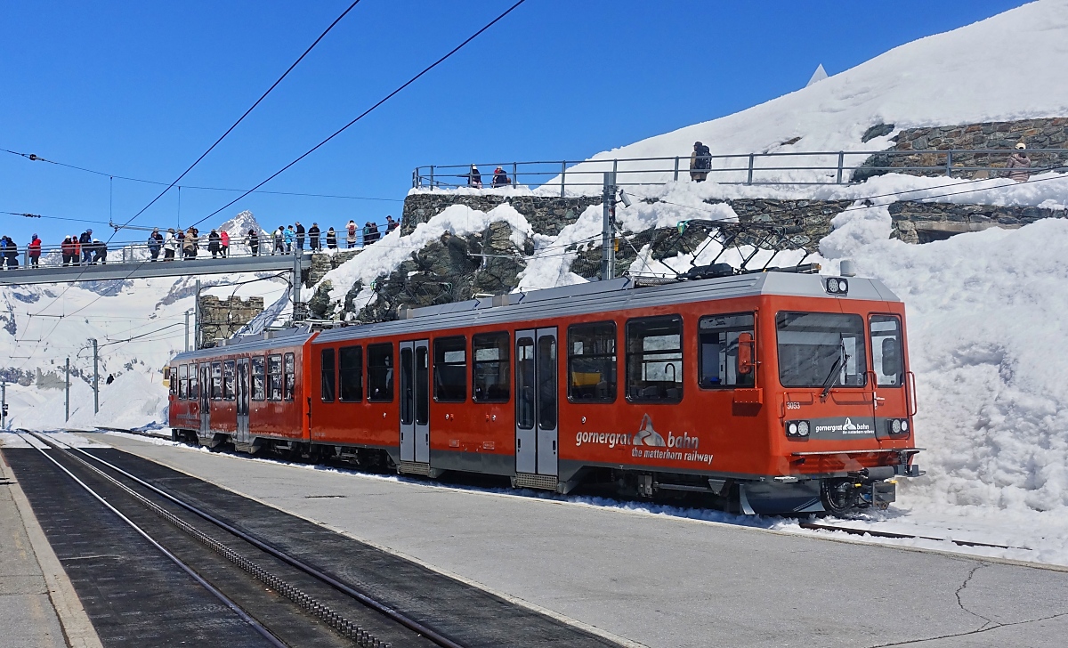 Noch einmal der Bhe 4/8 3053 der Gornergratbahn in der Bergstation, diesmal in Blickrichtung Südost