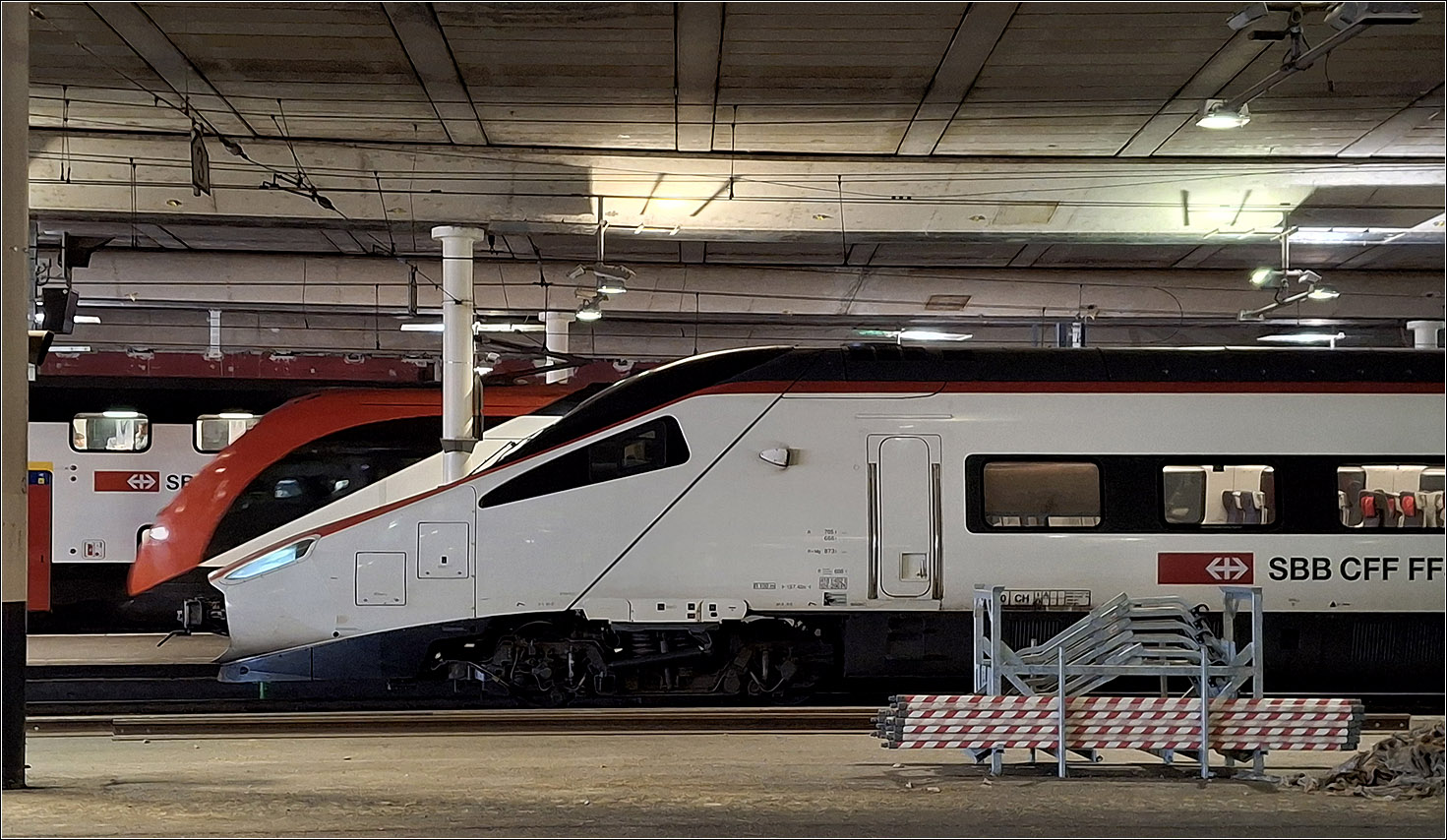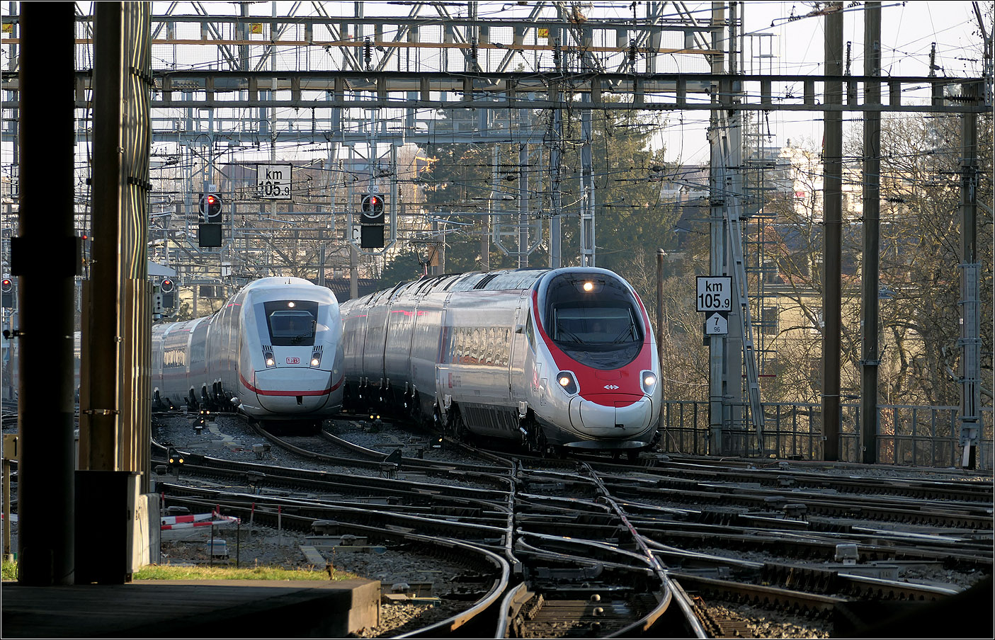 Nachschuss auf einen RABe 503, der mit einem EC auf dem Weg nach München am 24.02.2023 den Bahnhof Hergatz durchfährt. Hier ist zu erkennen, dass lediglich die Gleise 2 und 3 elektrifiziert worden sind. Am Tag der Aufnahme des elektrischen Betriebes wurde ausgerechnet der Premierenzug von Zürich nach München Murphys Gesetz folgend auf Gleis 1 geleitet...