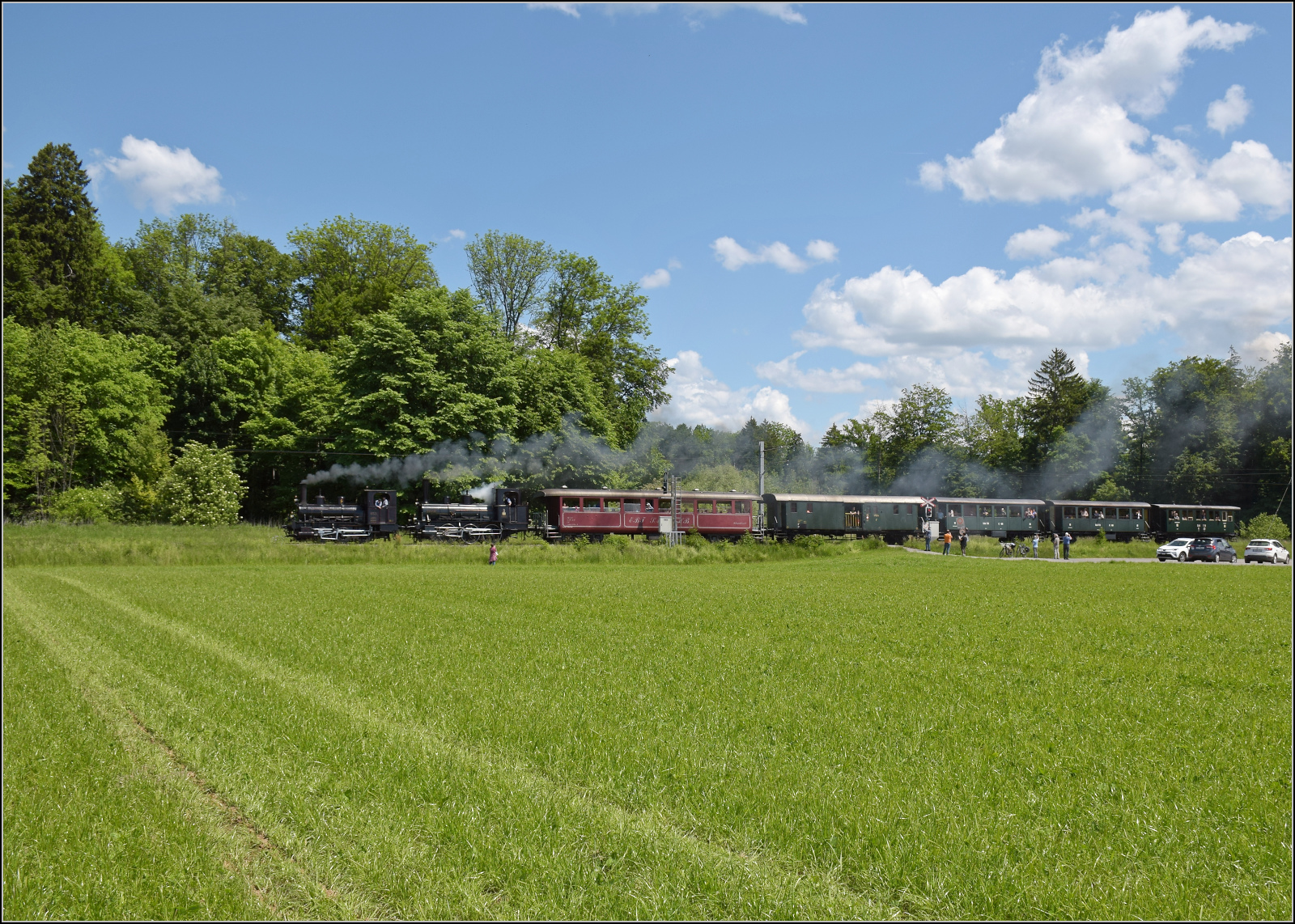 Hallo Walter, Hallo Olli, was für ein schönes Bild des Erstklassigen Doppel Pfeils. Ich denke dieser wartet im kleinen Bahnhof eine Überholung und/oder Kreuzung ab und ist nicht mit den Güter-, bzw. Dienstwagen im Hintergrund zusammen gekuppelt, und folglich, sorry Olli, kein Ersteklasse GmP. Dafür aber geniessen wir hier (einmal mehr) ein Erste Klasse Bild.
