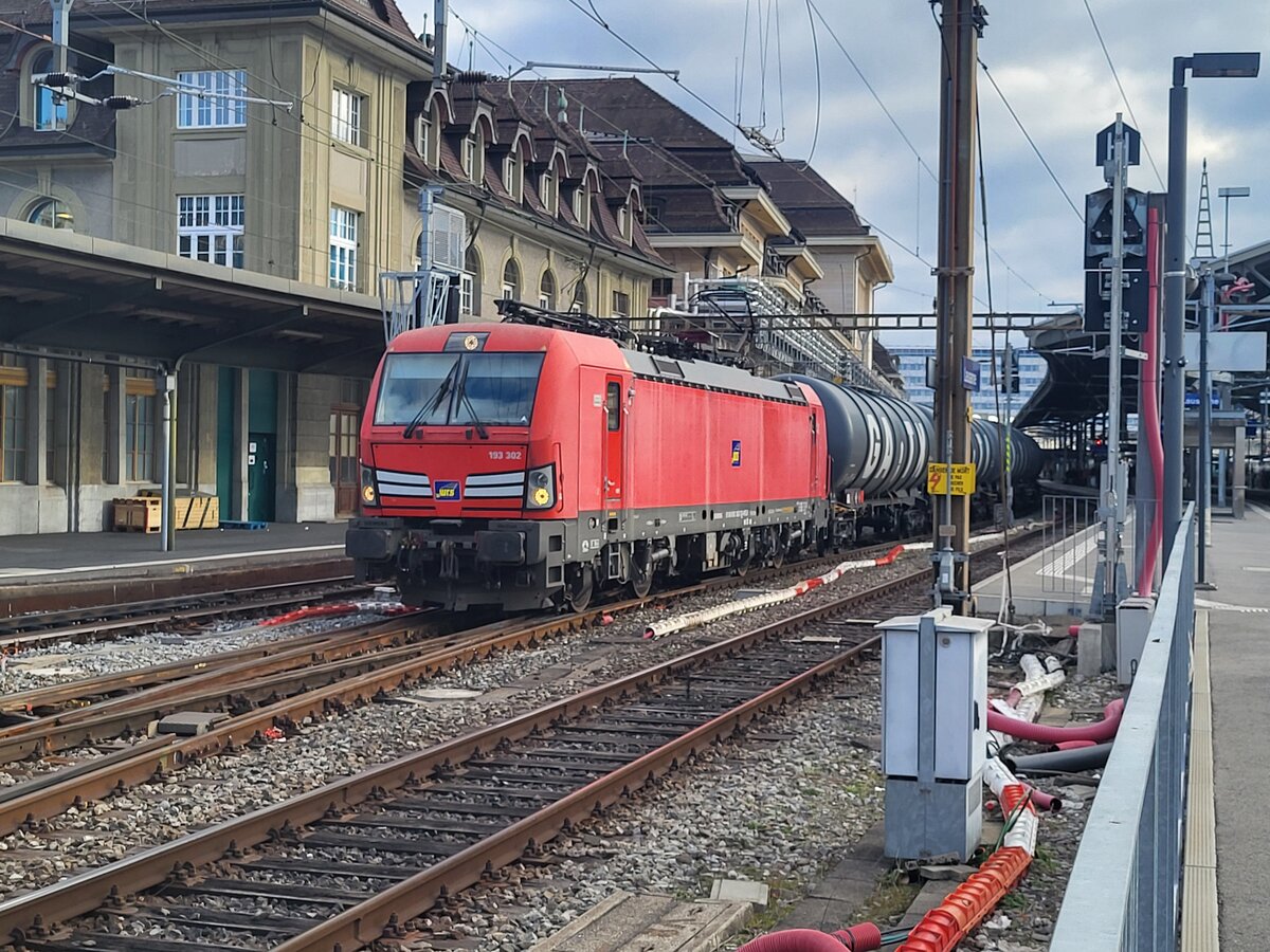 Eine E-Lok der Baureihe 185 ist seit etlichen Jahren eigentlich etwas alltägliches: In Lausanne hingegen bekommt man seit dem Ende der RTS diese Lokgattung eher selten zu sehen, so dass es sich selbst bei ungünstigem Licht anbot, die für die WRS fahrende 185 535 (UIC 91 80 6185 535-2 D-ATLU) zu fotografieren, die mit einem Kesselwagenblockzug auf Gleis 2 auf die Weiterfahrt wartet.