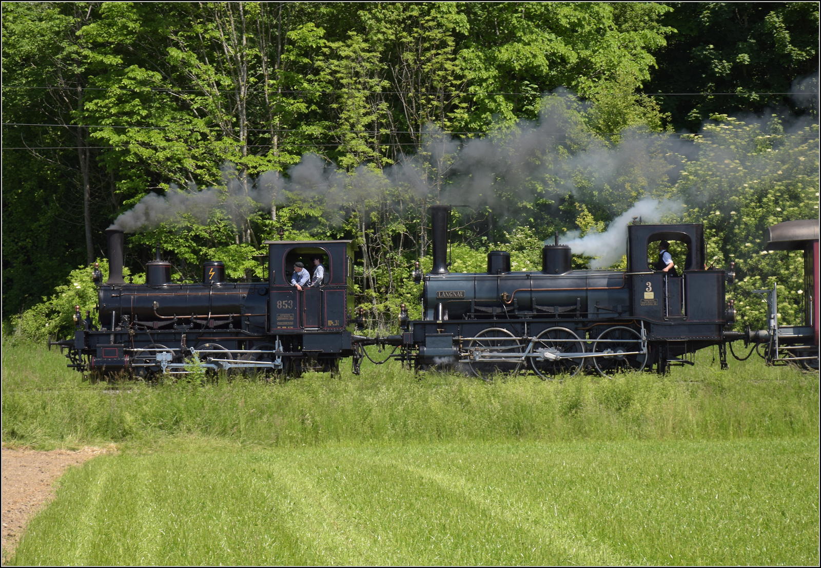 150 Jahre Emmentalbahn. E 3/3 853 der Jura-Simplon und Ed 3/3 3 'Langnau' der Emmentalbahn mit ihrem Sonderzug in ihrem historischen Revier entlang der Emme. Lyssach Schachen, Mai 2025. Man verzeihe mir, dass ich im Folgenden den Fokus unüblicherweise auf die zweite Lok lege. Denn Ed 3/3 Nr. 3 'Langnau' war der grosse Star des Festes, stammt sie mit Baujahr 1881 aus der Nachbestellung der Originalloks aus dem Eröffnungsjahr 1874. Die ebenso beachtenswerte Vorspannlok der JS aus dem Jahr 1890 muss bei der Bedienung der Bremsen aushelfen und kann deswegen unserer Jubilarin nicht den Vortritt lassen. (zum Bild)