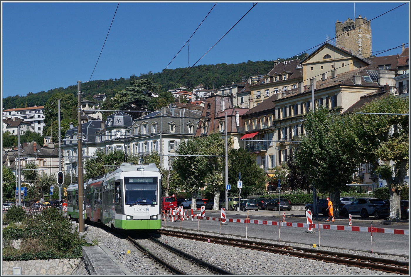 Der TransN Be 4/8 32 erreicht als Regionalzug R 15 5675 von Boudry kommend sein Ziel Neuchâtel Place Pury Littorail. 7. August 2025 (zum Bild)